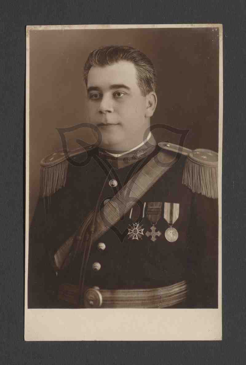 Studioaufnahme, gemalter Hintergrund. Der Soldat trägt eine dunkle Uniformjacke der königlich-rumänischen Armee mit Epauletten und drei Orden auf der Brust, ist nach links gewandt und blickt links an der Kamera vorbei.