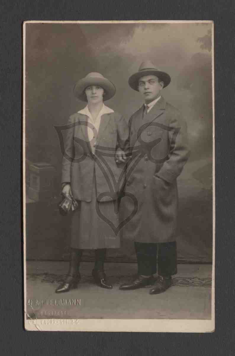 Studioaufnahme, gemalter Hintergrund. Das Paar steht aufrecht nebeneinander und blickt in die Kamera. Die Frau ist mit schwarzen Schuhen und Strümpfen, mit grauen Rock und Jacke, einem weißen Hemd und einem grauen Hut bekleidet. In der rechten Hand hält sie eine Tasche. Der Mann ist mit schwarzen Schuhen und Hosen, einem dunklen Mantel, weißem Hemd, bunter Krawatte und dunklem Hut bekleidet. Mit seinem rechten Arm hat er sich bei der Frau eingehakt, die linke Hand steckt in der Manteltasche. In der linken unteren Ecke der Prägestempel des Fotografen.