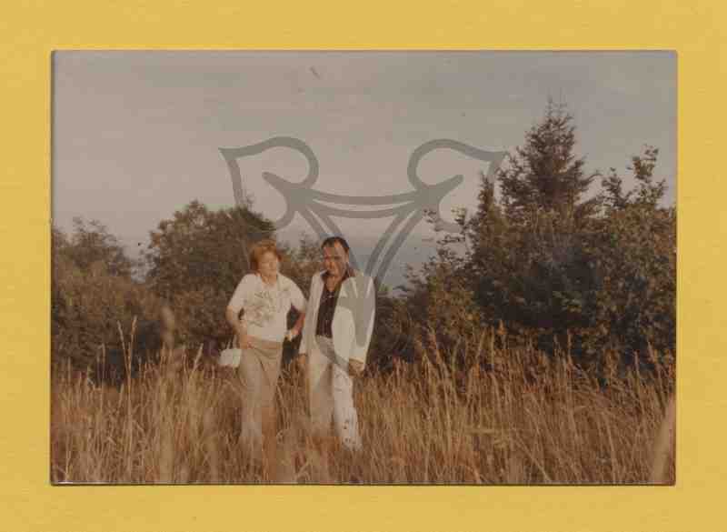 Das Paar steht nebeneinander, die Frau links, der Mann rechts, auf einem abschüssigen Hügel in hohem Gras, ist einander zugewandt und blickt in die Kamera. Im Hintergrund Büsche und Bäume, hinter dem Tal Hügelkette, darüber hellblauer Himmel.