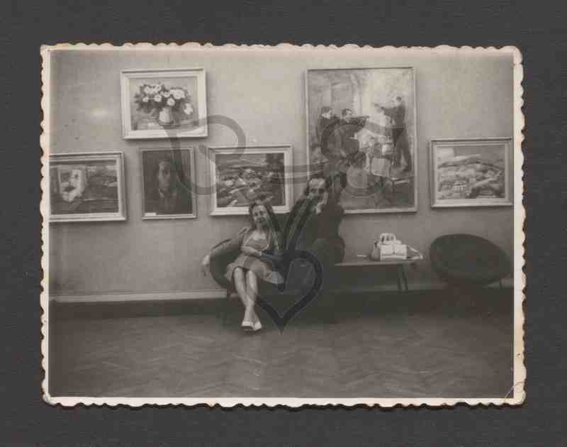 Das Paar befindet sich in einem mit Fischgrätenparkett ausgelegten Ausstellungsraum eines Museums. An der Wand hängen mehrere Gemälde. Davor stehen ein niedriger Tisch der von zwei dunklen Sesselstühlen eingerahmt ist. Im linken Stuhl sitzt die mit einem hellen Kleid bekleidete Frau. Sie trägt weiße Schuhe und eine lange Halskette, den rechten Arm hat sie auf der Stuhllehne abgelegt. Rechts neben ihr sitzt der in einen schwarzen Anzug gekleidete Mann. Er hat die Beine übereinander geschlagen, stützt sein Kinn in die rechte Hand und hat die linke auf die Schulter seiner Frau gelegt. Auf dem Tisch ganz links stehen zwei Handtaschen.