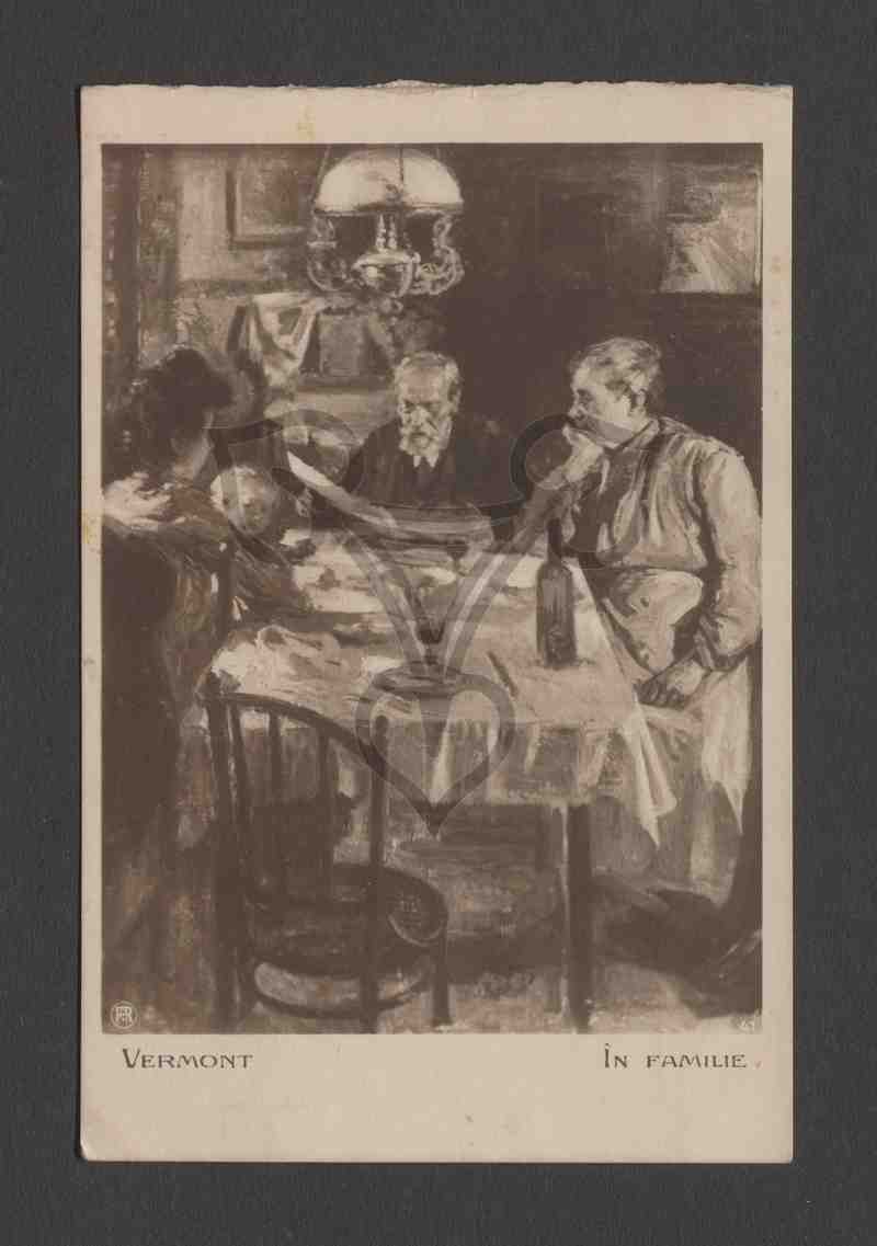 Fotografie eines Gemäldes. In einem Zimmer sitzen Großvater, Großmutter, Tochter und Enkelin an einem mit einem weißen Tischtuch gedeckten Tisch. Der Großvater, in dunklem Anzug gekleidet, liest Zeitung, die Großmutter, in heller Schürze und Oberteil, hat den rechten Arm auf die Tischplatte gelegt und stützt ihr Kinn in die Hand, blickt den Großvater an. Die Tochter hat dem Betrachter den Rücken zugewandt, hält das Kleinkind, ein Mädchen, auf dem Schoß, und blickt ebenfalls zum Großvater. Einzig das blonde Kind sieht in Richtung Betrachter. Auf dem Tisch Geschirr, davor ein leerer Stuhl, darüber ein Lüster; im Hintergrund Gemälde an der Wand.