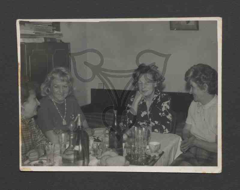 Die Frauen sitzen um einen reichgedeckten Tisch und sehen sich gegenseitig an. Hinter dem Tisch links ein Schrank, auf dem Stapel Papiere liegen, weiter rechts ein Sofa oder Bett, darüber, angeschnitten, ein Bild.