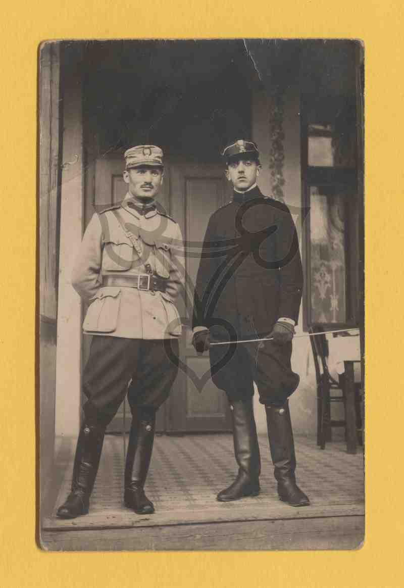 Die beiden Soldaten in rumänischer Uniform (Modell 1912) stehen nebeneinander leicht zueinander zugewandt in einem Raum. Der rechte trägt schwarze Stiefel und Hose, graue Jacke mit Gürtel und graue Schildmütze, der linke trägt eine komplett schwarze Uniform mit Handschuhen und hält in beiden Händen eine Reitgerte waagerecht. Hinter den Beiden eine Eingangstüre mit Oberlicht, am linken Bildrand ein senkrechter Pfosten, am rechten ein Fenster mit Oberlicht und Vorhängen, davor ein mit einer weißen Tischdecke gedeckter Tisch und ein Stuhl. Der Fußbodenbelag ist Bunt kariert.