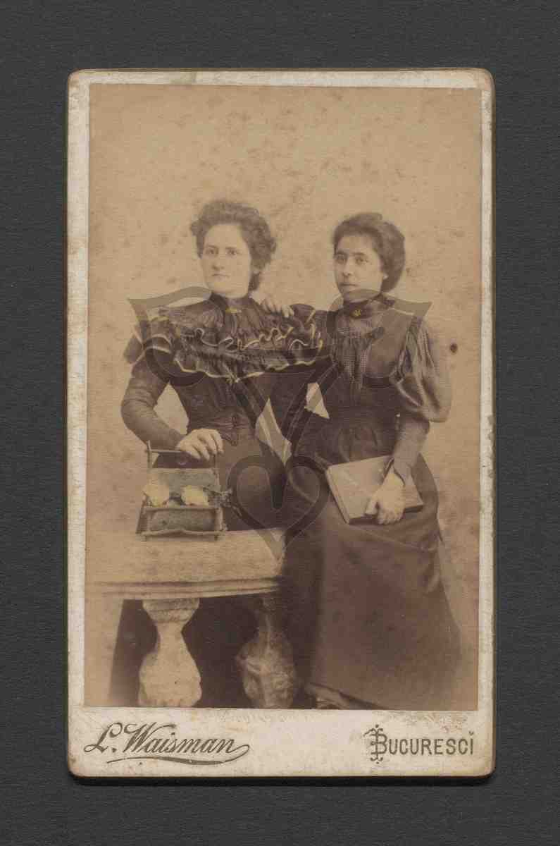 Studioaufnahme, neutraler Hintergrund, Geländer, Blumenhalter und Buch Requisite. Die beiden Frauen stehen nebeneinander, die linke hinter dem Geländer, die rechte darauf gehockt. Beide tragen sie lange dunkle Kleider, die linke stützt sich mit der rechten Hand auf den Blumenhalter, die linke hat sie der rechten Frau um die Hüfte gelegt. Die rechte Frau hält sich mit ihrer rechten Hand an der Schulter der linken Frau fest, in der linken Hand hält sie ein Buch. Beide blicken sie nach links an der Kamera vorbei.