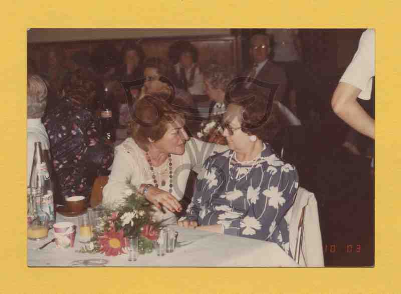 Die beiden Frauen sitzen in einem größeren Raum an einem weiß gedeckten Tisch, die linke beugt sich zu der rechten hinüber, hat ihre linke Hand auf die Stuhllehne der rechten Frau gelegt, ihren linken Ellenbogen auf die Tischplatte und hält die Hand über der Tischplatte. Sie trägt eine weiße Bluse, eine bunte Halskette und eine silberne Armbanduhr. Die rechte Frau, mit einer weiß gemusterten blauen Bluse bekleidet, trägt ein große Brille, große weiße Ohrringe und eine weiße Halskette. Sie ist zu der linken Frau gewandt und hat die Hände auf ihren Oberschenkeln gefaltet. Auf dem Tisch ein Blumengesteck, Gläser, eine Flasche, im Hintergrund viele Menschen an weiteren Tischen.