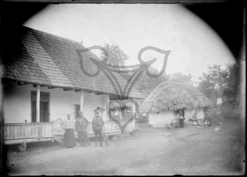 Vor einer Bauernhütte stehen zwei uniformierte Gendarmen und stützen sich auf ihre Gewehre. Links neben den beiden Männern steht eine Frau. Im Hintergrund rechts ist eine weitere, strohgedeckte Holzhütte mit Lehmverputz, vor der weitere Personen stehen. Über den Hof verteilt sind Hühner und Gänse.