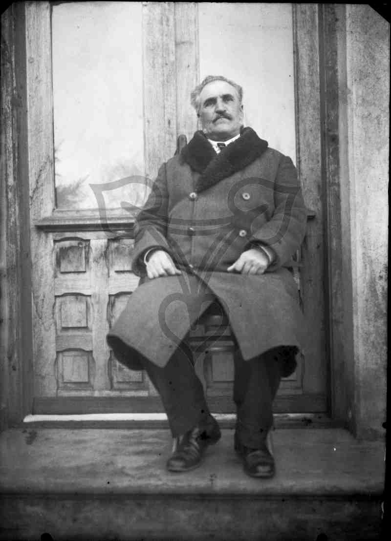 Vor einer teilverglasten Wohnungseingangstüre eines Gebäudes mit heller Wand sitzt ein Mann barhäuptig auf einem Stuhl. Er trägt schwarze Schuhe und Hosen sowie einen dunklen Mantel mit schwarzem Pelzbeschlag.