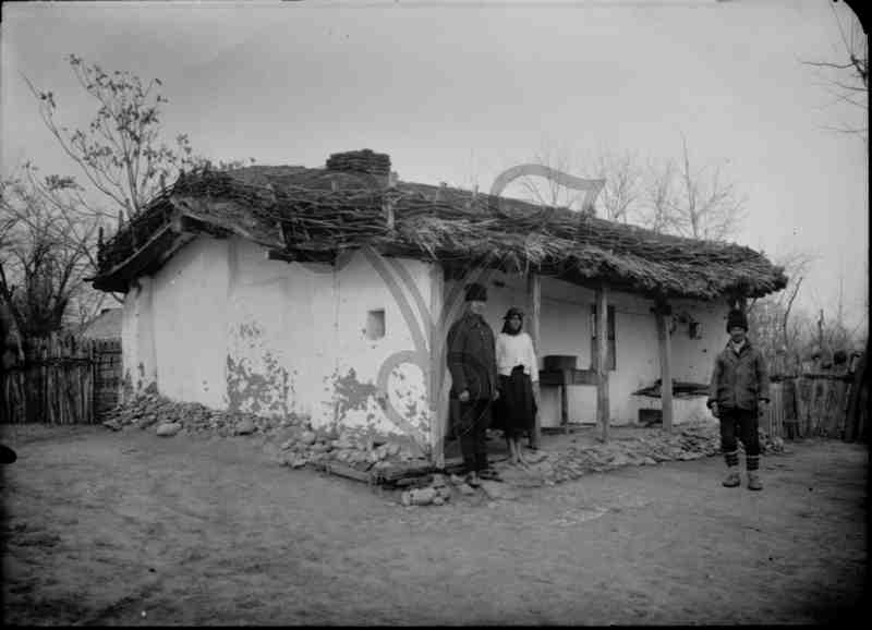 Außenansicht einer mit Maisstauden und Erde gedeckten Hütte. Vor deren linken Ecke steht ein Paar, der Mann in schwarz gekleidet, die Frau mit weißer Jacke, schwarzem Rock und dunklem Kopftuch. Weiter rechts steht ein weiterer Mann. Alle drei tragen die typische rumänische Alltagstracht und blicken in die Kamera. Am rechten Bildrand ist ein Holzzaun aus senkrechten Ästen zu erkennen, auf deren Spitzen einige Tonkrüge aufgesteckt sind.