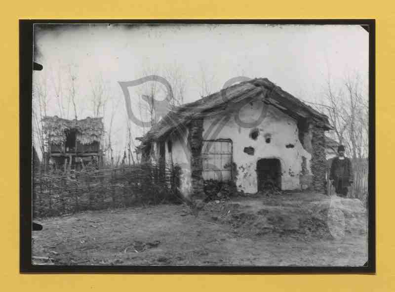 Ein halb verfallenes Haus, wahrscheinlich die Lizard Avenue um 1930. Links eine kleine auf Stelzen stehende und mit Maisstauden bedeckte Holzhütte. Rechts des Hauptgebäudes steht ein Mann in typisch rumänischer Arbeitstracht.