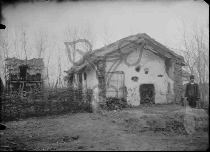 Ein halb verfallenes Haus, wahrscheinlich die Lizard Avenue um 1930. Links eine kleine auf Stelzen stehende und mit Maisstauden bedeckte Holzhütte. Rechts des Hauptgebäudes steht ein Mann in typisch rumänischer Arbeitstracht.