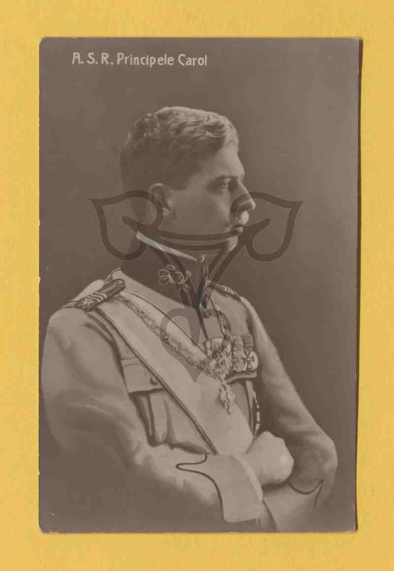 Studioaufnahme, gemalter Hintergrund. Halbbrustporträt. Der König trägt einen eine graue Uniformjacke mit Schärpe, Ordensband und mehreren Orden auf der Brust. Er hat die Arme vor der Brust verschränkt, ist nach rechts gewandt und blickt energisch nach rechts.