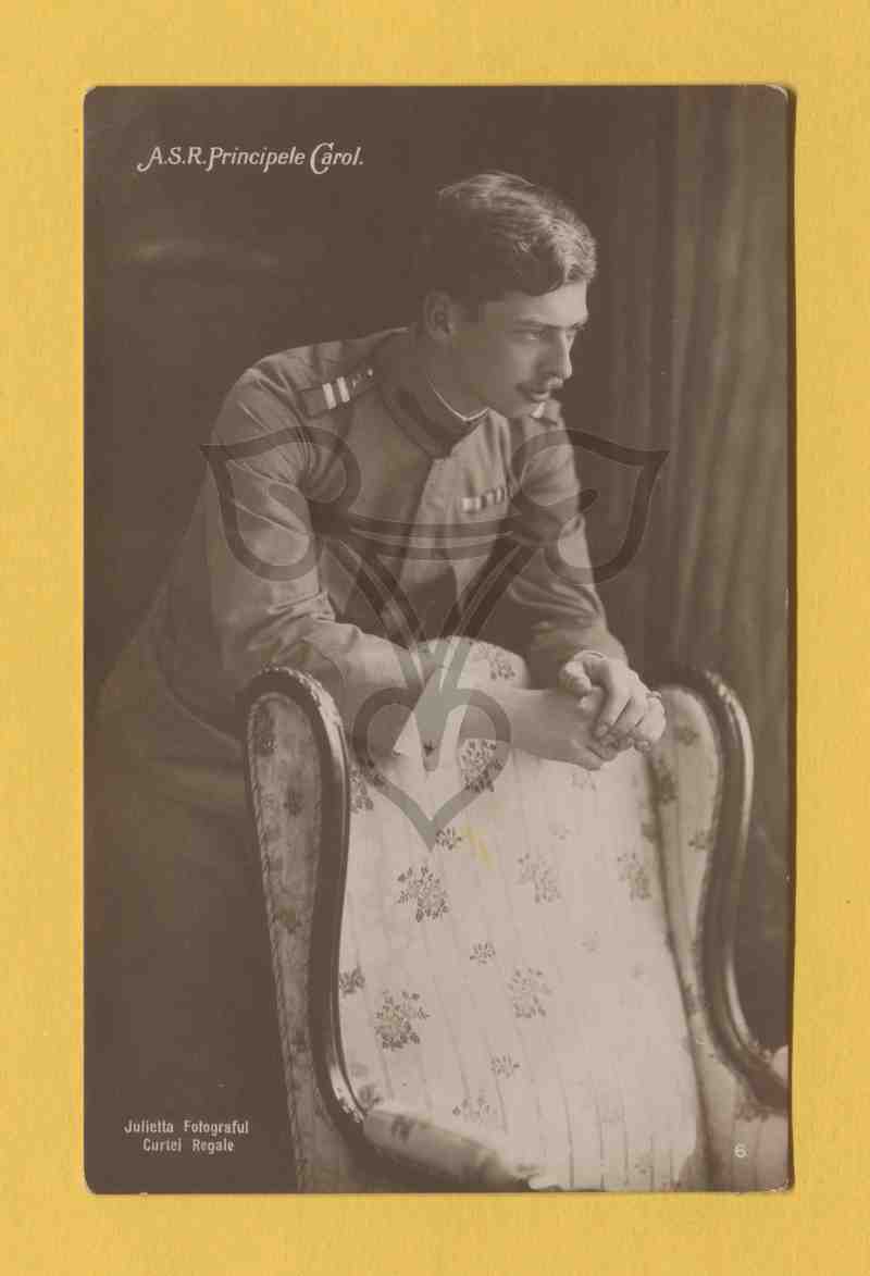 Der König steht in einem Raum, trägt eine Uniform und stützt seinen Oberkörper mit den beiden Unterarmen auf der Lehne eines Sessels ab.
