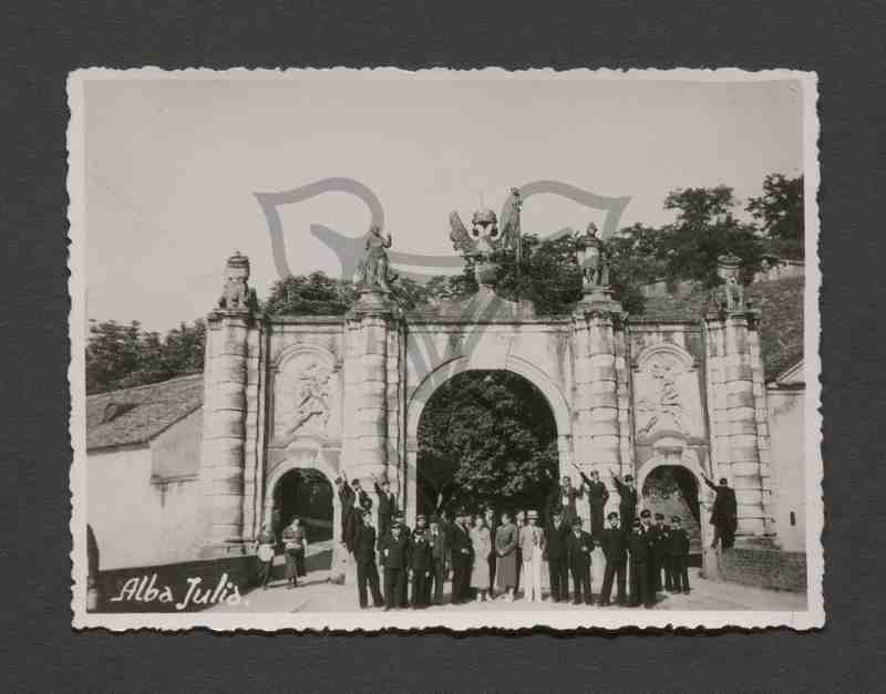 Reisegruppe, teils aus uniformierten Schülern bestehend, aus Caracal in Karlsburg. Die Gruppe posiert vor dem Tor stehend, teils mit Deutschem Gruß.