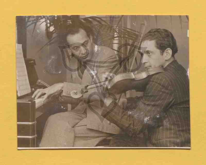 Pressefoto. Die beiden dargestellten Männer sitzen nebeneinander, der linke am Piano trägt einen hellen Anzug und blickt während des Spielens auf seinen Bruder. Der rechte, Alexander Horvath, trägt einen gestreiften schwarzen Anzug, spielt Geige und blickt nach links an der Kamera vorbei. Im Hintergrund des Raumes eine Zimmerpflanze.