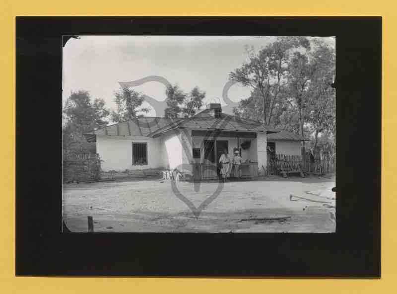 Außenansicht des weiß getünchten Wohngebäudes mit geschlossenem Eingang. Vor der gemauerten und überdachten Veranda steht ein Tracht tragendes Paar.