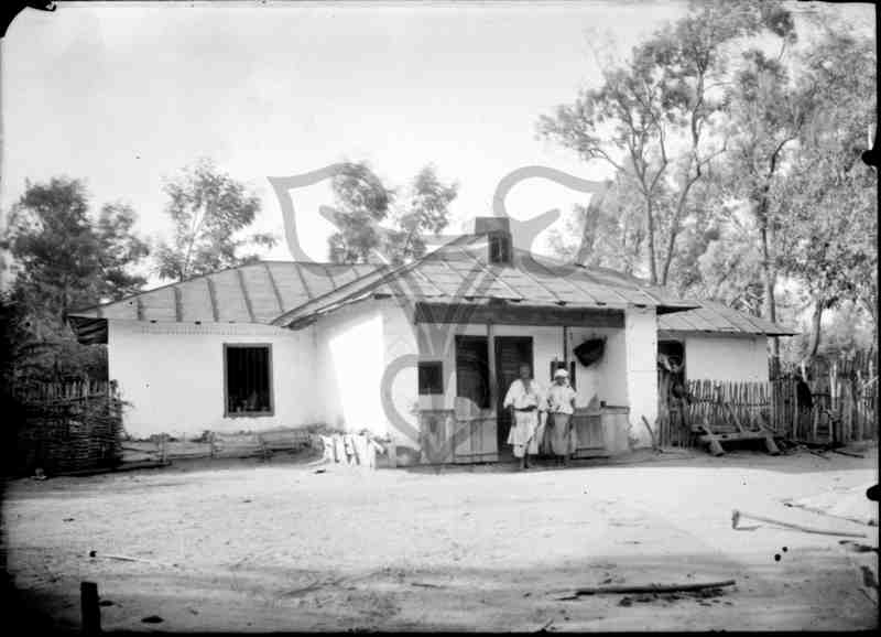 Außenansicht des weiß getünchten Wohngebäudes mit geschlossenem Eingang. Vor der gemauerten und überdachten Veranda steht ein Tracht tragendes Paar.