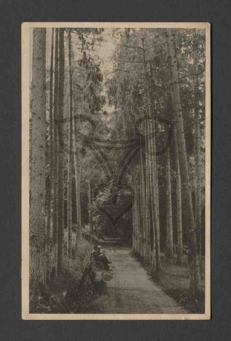 Blick auf eine unbefestigte Allee aus Nadelbäumen.