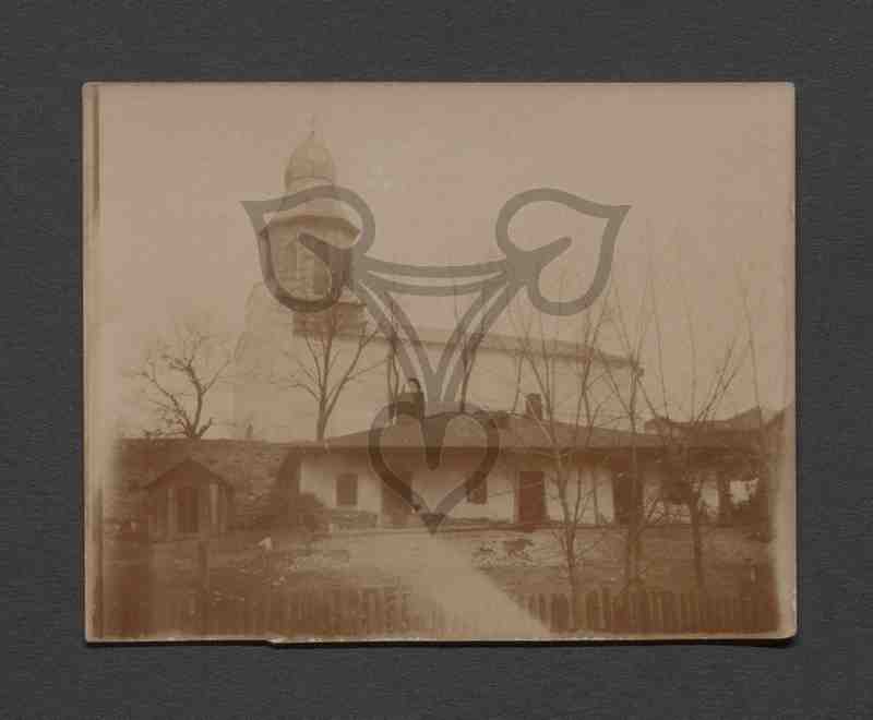 Außenansicht der orthodoxen Kirche. Im Hintergrund ein teils bewaldeter Felshügel, im Vordergrund gefällte Baumstämme.