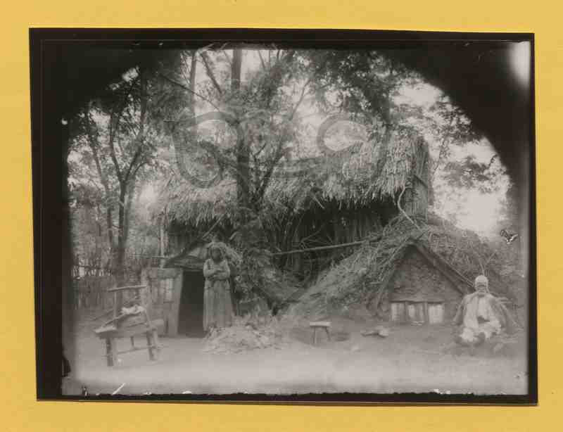 Vor dem Eingang zu einer Erdhütte steht eine ältere Frau, in der rechten unteren Bildecke sitzt ein älterer Mann neben einem verschlossenen bzw. zugemauerten Fenster der Erdhütte. Beide tragen traditionelle rumänische Alltagstracht. In der linken unteren Ecke steht auf einem hölzernen Untergestell ein nicht näher erkennbares Werkzeug, mittig zwischen den beiden Personen ein dreibeiniger Schemel. Hinter der Erdhütte ist ein aus hohen, senkrecht aufgestellten Baumstämmen gefertigter Anbau mit Strohdach.
