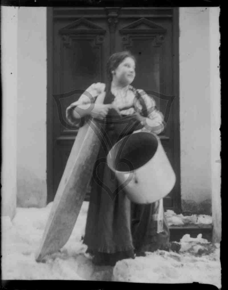 Die in traditioneller rumänischer Tracht gekleidete Jugendliche steht vor einem verschneiten, dekorierten Holzeingang. Mit ihrer rechten Hand hält sie einen handgeschnitzten Holzbottich fest, dessen ein spitzes Ende im Schnee liegt. Mit ihrer linken Hand hält sie einen großen Blechtopf fest und trägt gleichzeitig mit beiden Händen einen weiteren Topf. Sie blickt nach rechts.