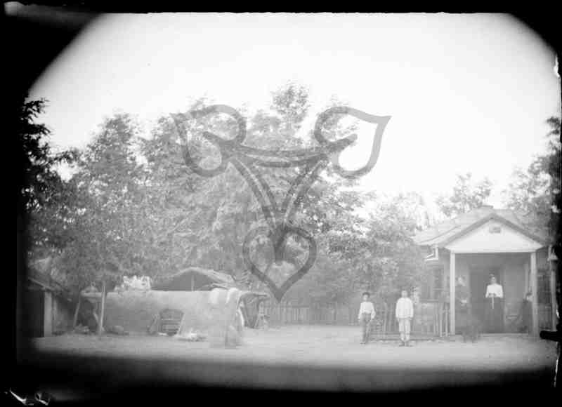 Am linken Bildrand ist eine halb unter der Erde liegende Hütte mit dahinter liegendem Anbau zu erkennen. Am rechten Bildrand ein oberirdisches Gebäude mit überdachter Eingangstüre. Auf der Veranda vor der Türe stehen zwei Frauen, die rechte mit schwarzem Rock und weißer Bluse, die linke in dunklem Rock und Jacke gekleidet. Bildmittig rechts, vor dem Zaun rechts neben der Veranda, stehen zwei Jungen. Alle Personen blicken in die Kamera. Zwischen den beiden Gebäuden befinden sich eine größere Hoffläche, dahinter ein Holzzaun und Bäume.