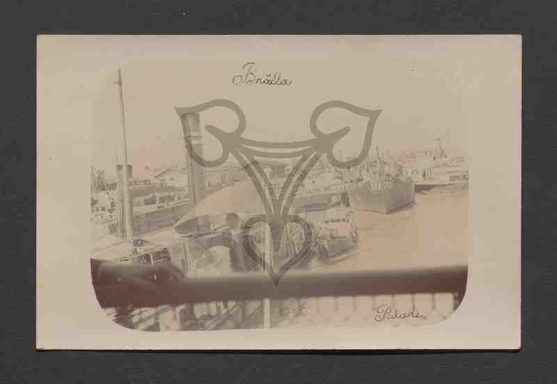 Blick von einer Brücke auf eine Hafenanlage mit vielen Dampfschiffen von Brăila.