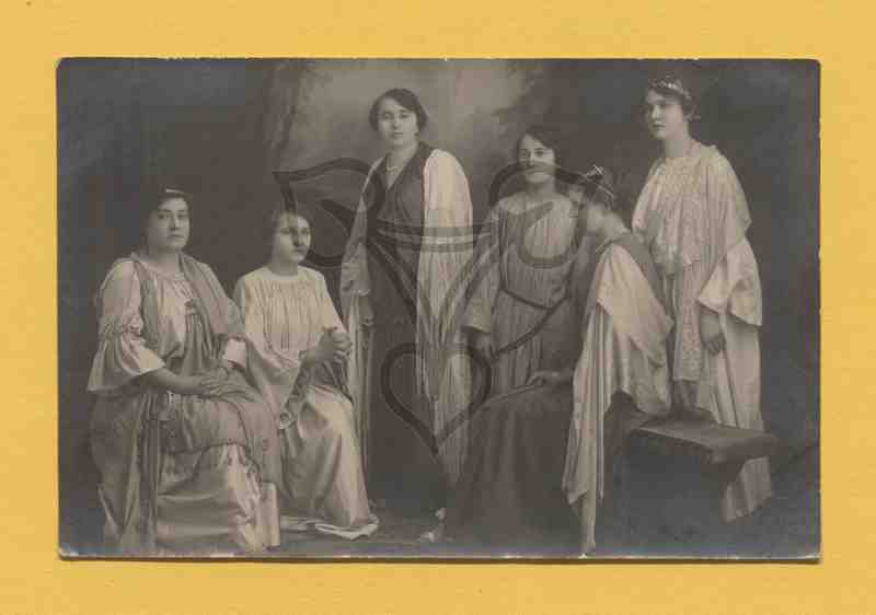 Studioaufnahme, gemalter Hintergrund. Die Aufnahme zeigt eine Gruppe kostümierter Schauspielerinnen des Theaters in Brăila.