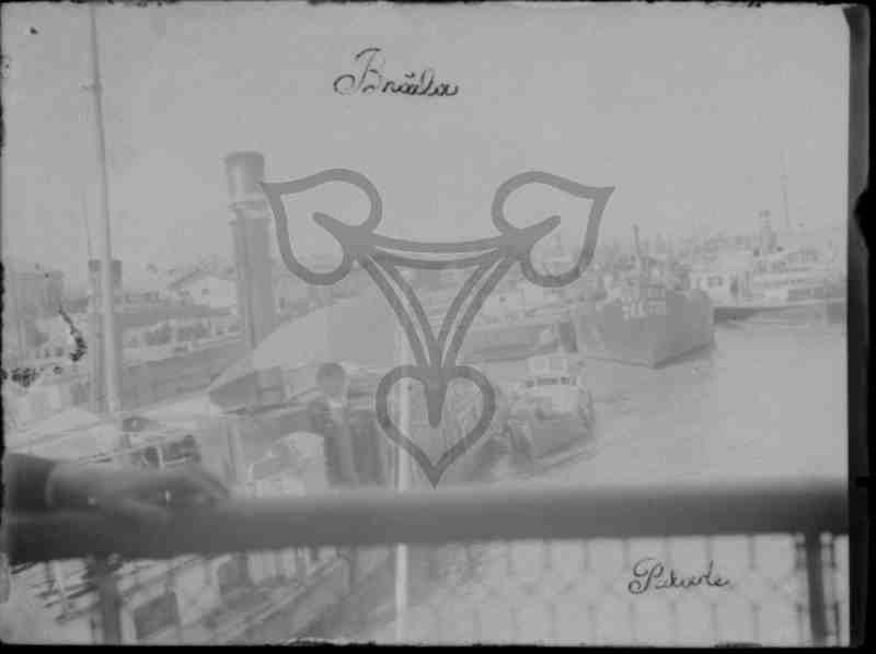Blick von einer Brücke auf eine Hafenanlage mit vielen Dampfschiffen von Brăila.
