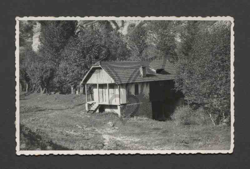 Außenansicht der Wassermühle. Zu erkennen ist der an der Stirnseite überdachte Aufgang zum Gebäude und in der hinteren, rechten Hälfte der Längsseite ein waagerechtes Wasserrad mit senkrechter Achse. Ganz rechts am Gebäude, von einem Baum teilweise verdeckt, der Wassereinfall des Mühlbachs. Im Vordergrund Wiese, im Hintergrund, an den beiden Ufern des Baches, Baumreihen. Dahinter steil aufragende Felswand.