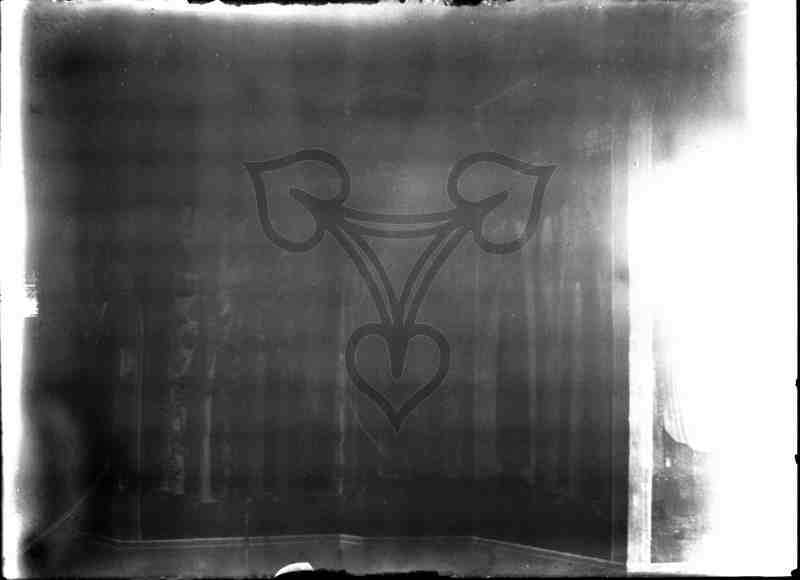 Innenansicht des Kirchenraums. Zu großen Teilen unterbelichtete Glasplatte. Schwer erkennbar einige Personendarstellungen in dem gemalten Wandschmuck.