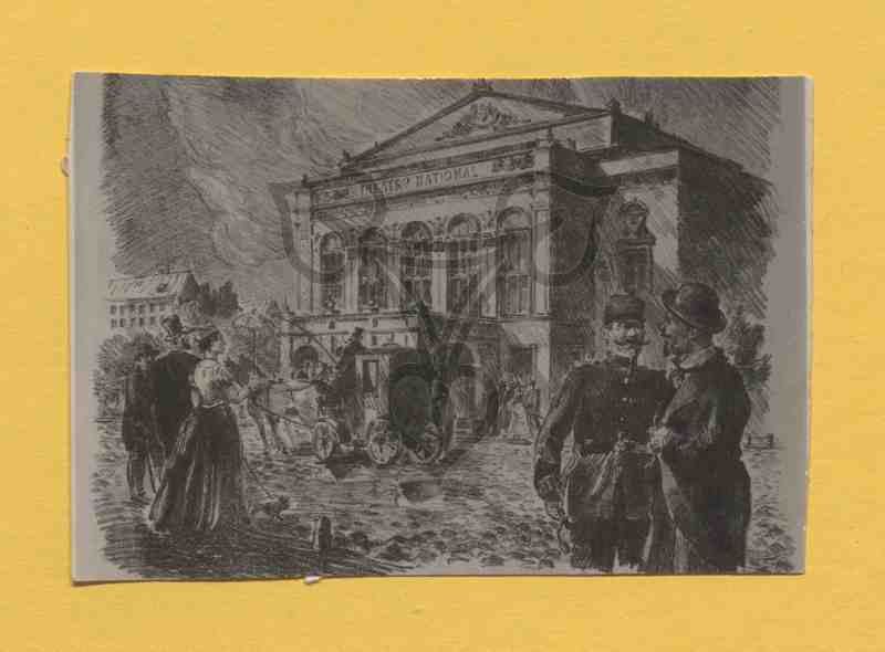 Die Abbildung zeigt eine historische Darstellung des 1852 eröffneten Nationaltheaters in Bukarest, wie es im späten 19. Jahrhundert aussah. Auf dem Giebel ist der Schriftzug „Theatru Național“ zu erkennen. Es wurde während des Zweiten Weltkriegs durch Bombenangriffe zerstört. Die Szene zeigt Menschen in zeitgenössischer Kleidung und Kutschen vor dem Gebäude. Stich von etwa 1883.