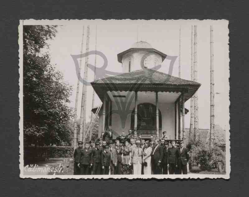 Reisegruppe, teils aus uniformierten Schülern bestehend, aus Caracal in Călimănești. Die Gruppe posiert in mehreren Reihen stehend vor dem Westeingang der Kirche.