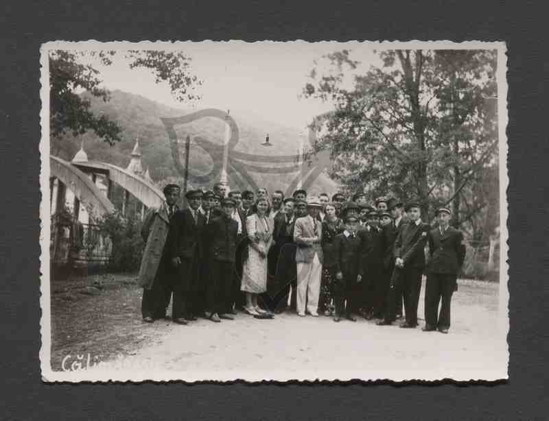 Reisegruppe, teils aus uniformierten Schülern bestehend, aus Caracal in Călimănești. Die Gruppe posiert in mehreren Reihen stehend auf der Grünfläche vor einer Brücke.