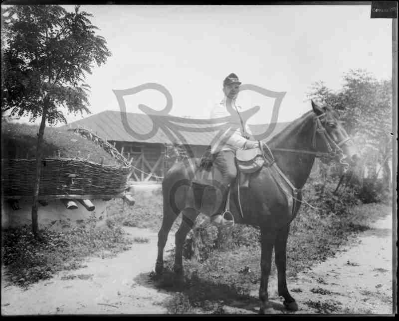 Auf einem Kiesweg sitzt der Soldat in heller Uniform auf seinem Pferd. Im Hintergrund rechts ein hölzernes Gebäude, am rechten Bildrand eine Erdhütte, links und rechts des Weges Büsche und Bäume.