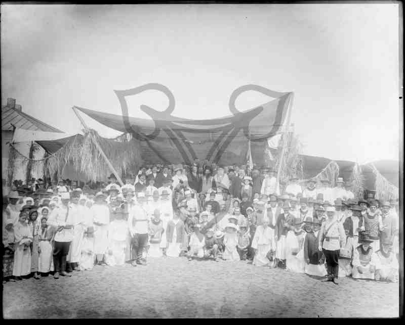 Auf einem freien Marktplatz ist ein großes Stoffzelt aufgebaut, unter dessen Dach sich in mehreren Reihen halbkreisförmig eine große Menschenmenge beiderlei Geschlechts und unterschiedlichsten Alters versammelt hat. Viele der Personen tragen rumänische Tracht, unter dem Dach sind zwei orthodoxe Popen zu erkennen, ebenso einige Uniformträger. Weitere Angaben zum Anlass der Veranstaltung fehlen.