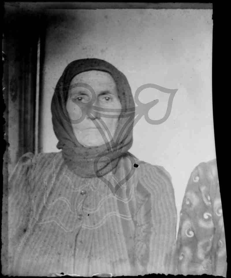 In einem Raum vor einer hellen Wand sitzt eine ältere Frau und blickt in die Kamera. Sie trägt eine dunkle, längs gestreifte Bluse und ein dunkles Kopftuch. Neben ihr angeschnitten sitzt eine zweite Person, vermutlich ebenfalls eine Frau. Glasplatte gebrochen, linker Teil fehlt.