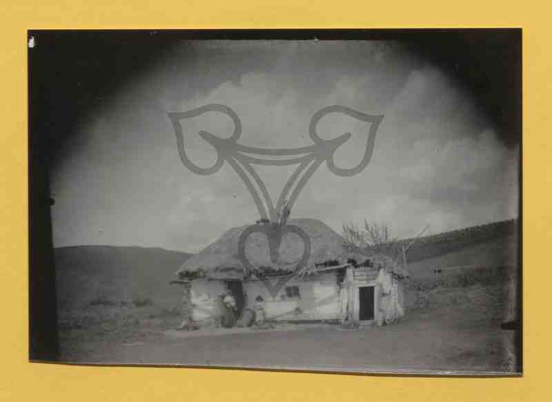 Auf offenem Feld steht ein in Blockhausmanier errichtetes Haus mit Eingang, Fenster und Anbau auf der rechten Seite. Das Dach ist Strohgedeckt. Links neben dem Eingang steht eine Frau, bekleidet mit einem dunklen Rock, weißer Bluse und Kopftuch. Im Arm hält sie im Steckkissen ein Kleinkind. Rechts neben dem Eingang ist ein Kartoffelsack an die Wand gelehnt, rechts daneben steht ein weiß gekleideter Junge mit Strohhut.