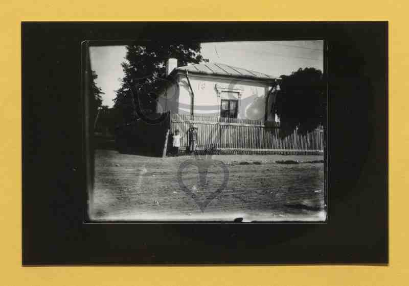 Bildmittig steht eine Frau und hält ein Kleinkind auf den Armen, links neben ihr stehen zwei weitere Kinder. Im Hintergrund die weiß getünchten Wände, am linken Bildrand ein Tisch mit einem Kupferkessel und Geschirr. An der Wand hinter den Personen mehrere Säcke, darüber eine Holzmolter sowie ein Mehlsieb. Rechts neben der Frau auf Kopfhöhe ein Ablagebrett auf dem Geschirr steht, in der rechten unteren Bildecke eine tönerne Feuerstellenabdeckung.