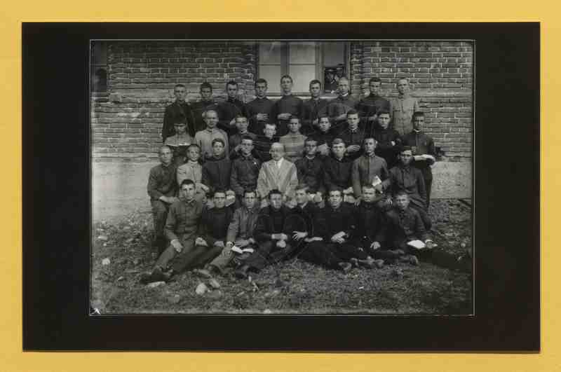 In mehreren Reihen angeordnete Schülergruppe, ausschließlich junge Männer, stehen bzw. sitzen im Freien vor einem unverputzten Gebäude aus Ziegelsteinen. Im Bildmittelpunkt sitzt ein Lehrer. Alle Schüler tragen Schuluniform.