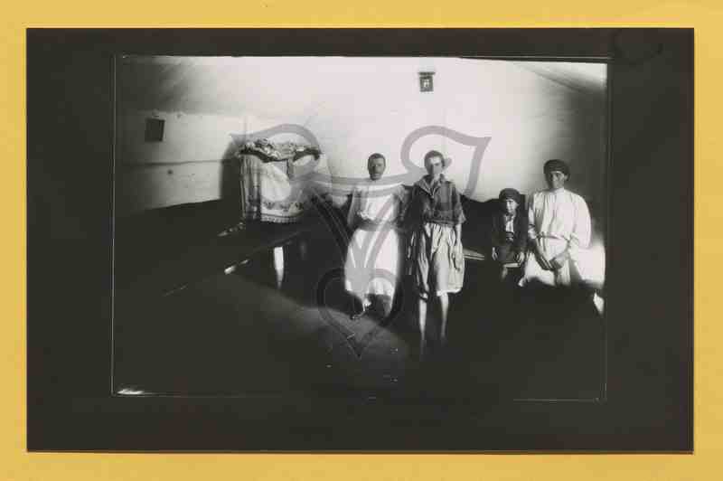 Bildmittig steht ein Paar vor der Giebelwand, rechts neben der Frau sitzt ein Kind sowie rechts neben diesem eine ältere Frau auf einer Schlafstätte. Alle vier Personen tragen Elemente der rumänischen Alltagstracht, die Frau einen Rock, der bis kurz unter die Knie reicht. Entlang der Längs- sowie der Giebelwand laufen Schlafstätten, in der rechten Raumecke ist das zusammengelegte Bettzeug mit einer bunt bestickten Decke abgedeckt.