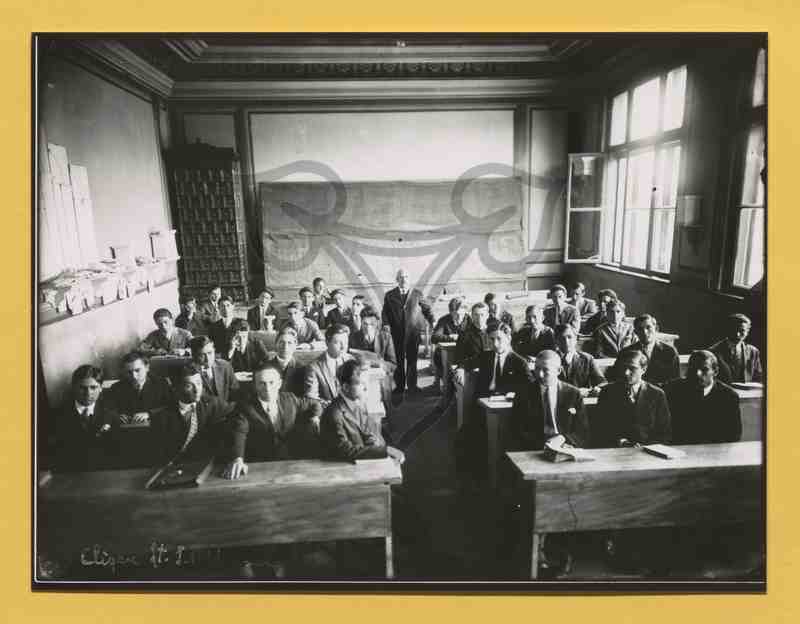 Bildmittig im Hintergrund steht zwischen zwei Schulbankreihen der Lehrer, stützt sich links und rechts auf den Bänken ab und blickt in die Kamera. In den Bänken sitzen zu dritt bzw. zu viert ausschließlich männliche Schüler. Sie tragen alle dunkle Anzüge, weiße Hemden und bunt gemusterte Krawatten. In der hinteren linken Raumecke ein großer Kachelofen, rechts daneben vermutlich eine Tafel, am rechten Bildrand eine Fensterfront. Vgl. auch PB 207/541.
