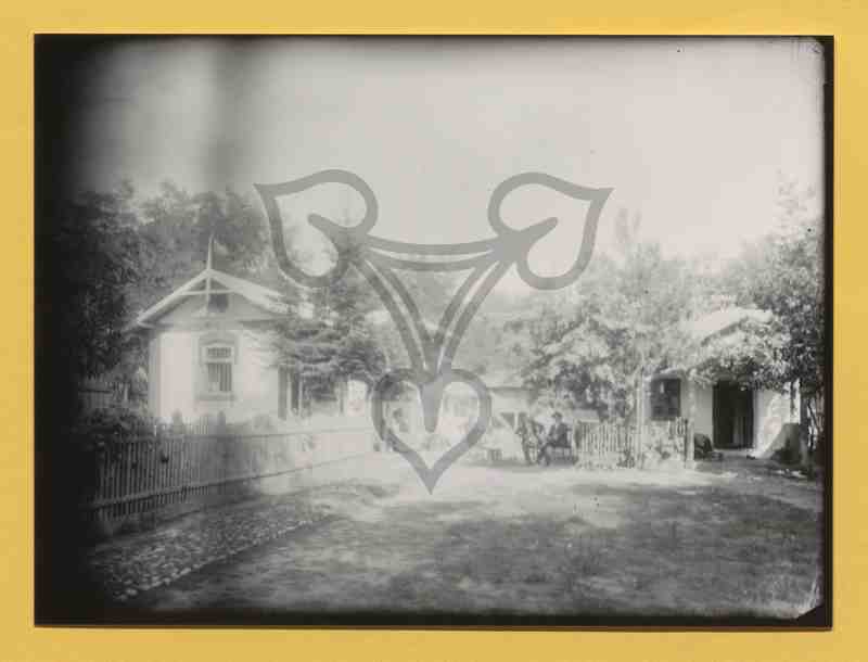 Bildmittig ist eine unbefestigte Straße zu erkennen, rechts ein gepflasterter Bürgersteig, an den Bildrändern, teils hinter hölzernen Zäunen, Gebäude. Bildmittig rechts sitzt ein Mann im schwarzen Anzug auf einem Stuhl. Glasplatte stark überbelichtet.