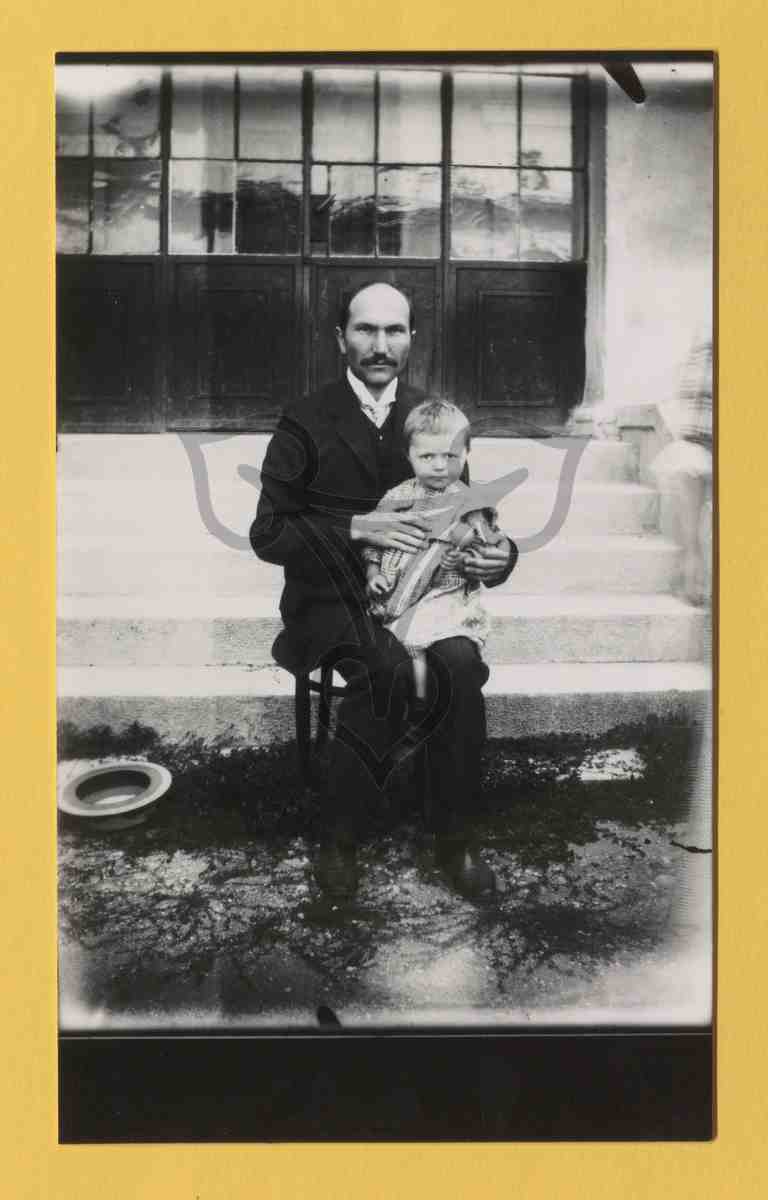 Vor einer zum großen Teil verglasten Hauswand im Freien sitzt ein Mann in dunklem Anzug auf einem Stuhl und Hält ein Kleinkind auf dem Schoß.
