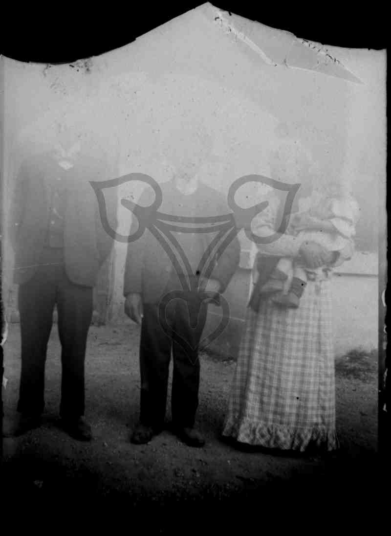 Vor einem Gebäude mit weiß getünchter Wand stehen nebeneinander zwei Männer in dunklen Anzügen und ganz rechts eine Frau in hellem Kleid. Der Rock ist bunt kariert. In den Armen hält sie ein Kleinkind.