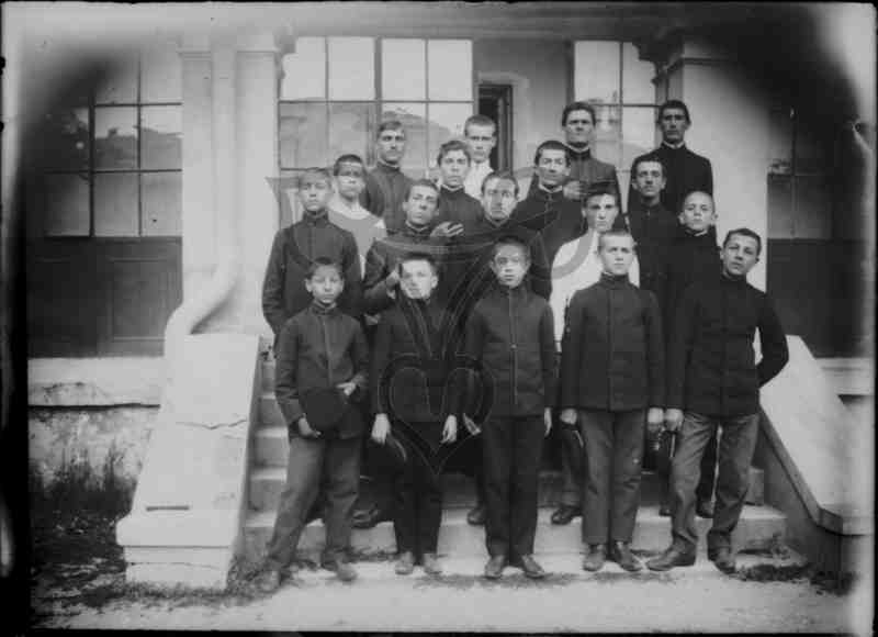 Vor einer zum großen Teil verglasten Hauswand im Freien stehen auf der Zugangstreppe in drei Reihen hintereinander Schüler des Caracaler Gymnasiums in Schuluniform nebeneinander.