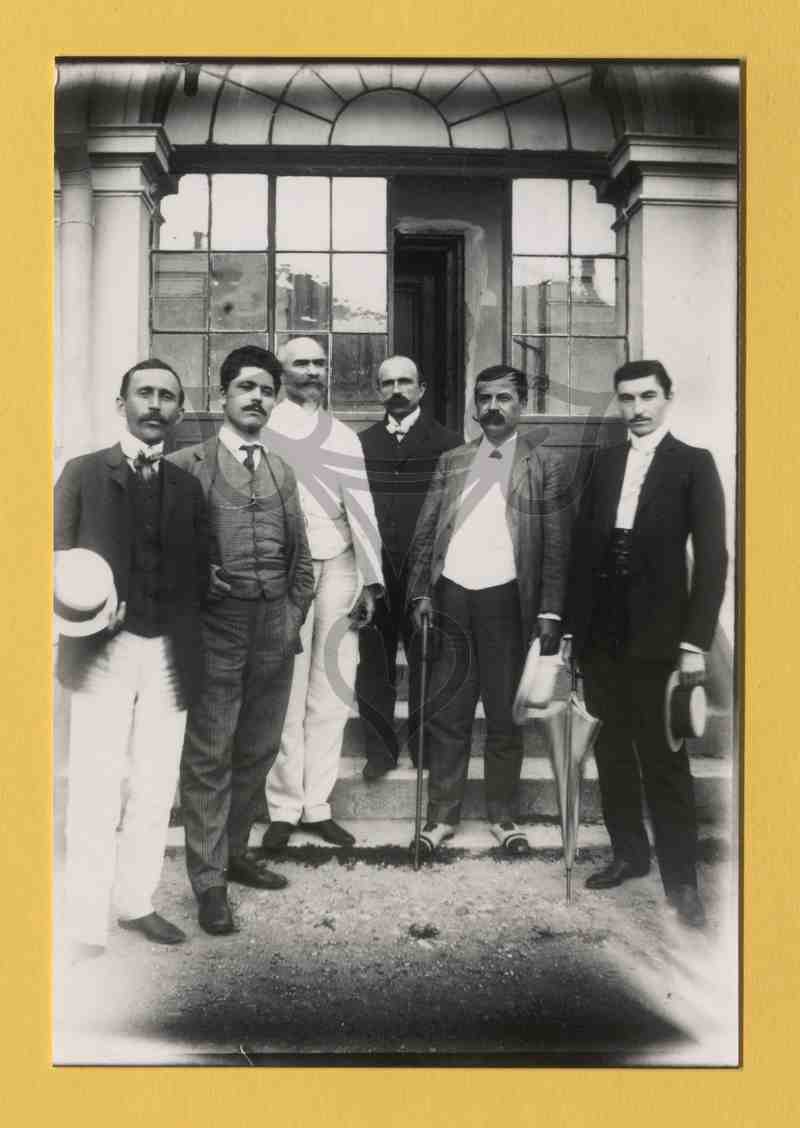 Vor einem Gebäude mit verglaster Eingangstüre steht eine Gruppe von sechs Männern, die alle in die Kamera blicken. Vgl. auch PB 207/220.
