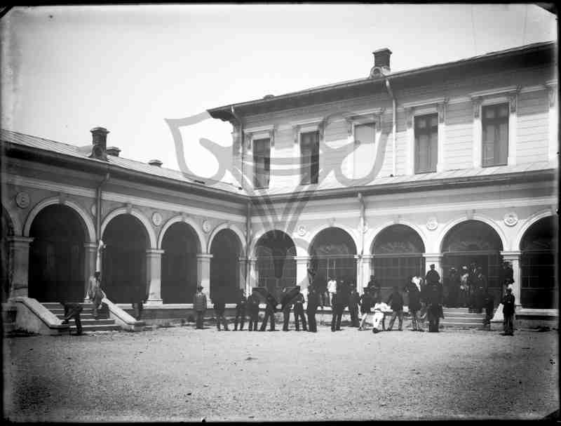 Im Innenhof eines mehrflügliges, teils mehrgeschossigen Gebäudes mit teils verglasten Arkaden und hellen Außenwänden befindet sich eine größere Männergruppe überwiegend stehend locker nebeneinander verteilt. Auf den beiden linken und rechten Treppenabsätzen befinden sich Männer in Anzügen, die restlichen tragen Uniform.