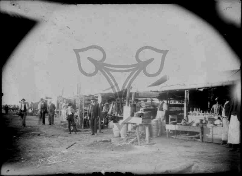 Markttreiben in Caracal. Blick auf eine Zeile hölzerner Verkaufsbuden mit unterschiedlichsten Produkten.