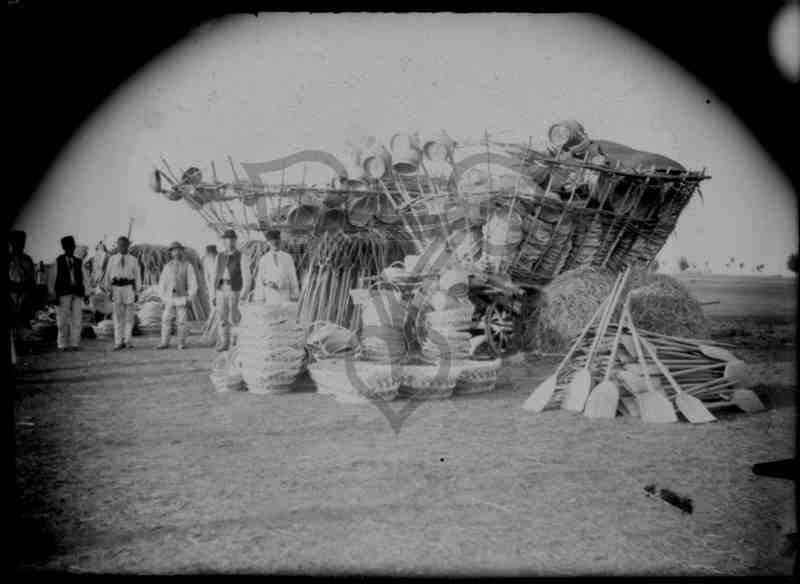 Markttreiben in Caracal. Abgebildet sind Tracht tragende Männer neben einem hoch beladenen Leiterwagen. Auf und vor diesem befinden sich Weidekörbe, Holzschaufeln, hölzerne Heugabeln, Bottiche und Fässer. Neben dem Waben liegt auch ein Haufen Stroh