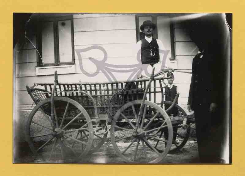 Vor einem Gebäude mit heller Wand steht ein Leiterwagen. Die Zugtiere sind von einem am rechten Bildrand stehendem Mann verdeckt. Auf dem Wagen steht ein Tracht tragender Mann und hält die Zügel in der Hand. Direkt an der Wand hinter dem Wagen steht ein weiterer Mann.